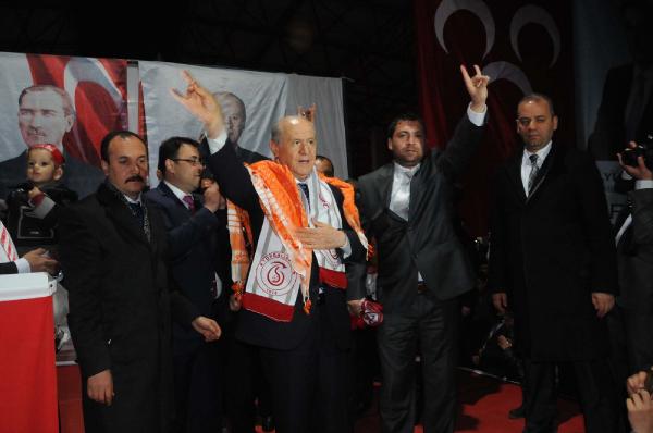 Coşkulu bir kalabalığa seslenen Bahçeli, 'Bu iktidarın ömrü tükenmiştir. Recep Tayyip Erdoğan'ın ülkeyi yönetecek bir ak yüzü kalmamıştır. Recep Tayyip Erdoğan'ın 28 Ağustos'ta Cumhurbaşkanı olma ihtirası sona ermiştir. Sırtındaki yolsuzluk yüküyle rüşvetle Çankaya yokuşunu çıkamaz, yolda dizi çözülür, nefesi kesilir. Onun için Recep Tayyip Erdoğan açısından Cumhurbaşkanlığı hayaldir, rüyadır. Artık iktidarın değişme zamanı da gelmiş demektir. Yolda gelirken bir pankart dikkatimi çekti. Bayındır İlçesi'nin çıkışında gördük. Orada çok güzel yazıyor. 'Çal çal nereye kadar. Yetti artık buraya kadar' değerli arkadaşlarım. İşte 30 Mart nereye kadarı soruyor. 30 Mart'tan sonraki seçimler de hep beraber diyor artık yeter buraya kadar diyor' diye konuştu. Bahçeliye konuşmasının ardından Türkmen poşusu hediye edildi. Bir partilinin çocuğunu kucağına alan Bahçeli, daha sonra Torbalı'dan ayrılarak Buca'ya geçti.