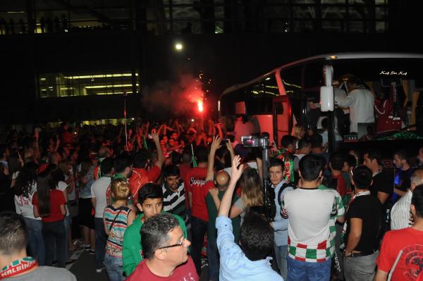 Pınar Karşıyaka, özel uçakla saat 01.30'da İzmir'e hareket etti. Uçakta AK Parti Genel Başkan Yardımcısı, İzmir Milletvekili Nükhet Hotar, futbol şubesi sponsoru Erdal Acar, yönetim, Teknik Direktör Cüneyt Dumlupınar ve bir grup taraftar da takımı yalnız bırakmadı. 'Kaf-Kaf' olarak tanınan ekibin uçağı tezahüratlarla İzmir Adnan Menderes Havalimanı'na indi. Kafileyi alanda gece 03.30'da binlerce taraftar yine meşalelerle karşıladı. Yüzlerce araçlık konvoyla Karşıyaka Çarşı'ya hareket eden kafile, Alaybey'de üstü açık otobüse geçti.