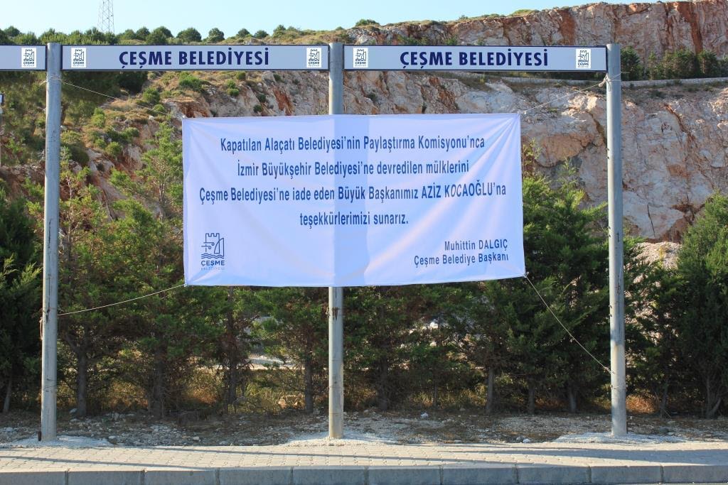 Alaçatı'nın girişinde belediyenin kendi imkanlarıyla 2009 yılında yaptığı yeraltı otoparkı ve Alaçatı'nın mimari özelliklerine göre yapılan yaklaşık 100 milyon değerindeki 34 dükkanın yeniden Çeşme Belediyesi'ne devredilmesinin ardından Çeşme Belediye Başkanı Muhittin Dalgıç, İzmir Büyükşehir Belediye Başkanı Aziz Kocaoğlu'na teşekkür ederek ilçenin farklı yerlerine de teşekkür mesajları astırdı. Teşekkür mesajında Başkan Dalgıç şu sözlere yer verdi: 'Kapatılan Alaçatı Belediyesi'nin Paylaştırma Komisyonu'nca İzmir Büyükşehir Belediyesi'ne devredilen mülklerini Çeşme Belediyesi'ne iade eden Büyük Başkanımız Aziz Kocaoğlu'na teşekkürlerimizi sunarız.'