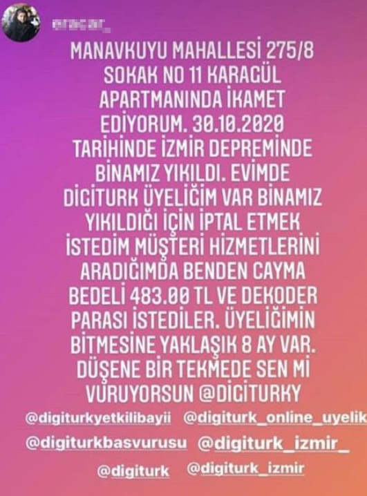 EGEDESONSÖZ – İzmir'de yaşanan büyük deprem sonrası evi yıkılan Mustafa E., Digiturk aboneliğini iptal ettirmek isteyince kendisinden 483 TL cayma bedeli ve dekoder parası istendiğini iddia etti.. Yaşadığı durumu 'düşene bir tekme de sen mi vuruyorsun' notuyla sosyal medya hesabından paylaştı.