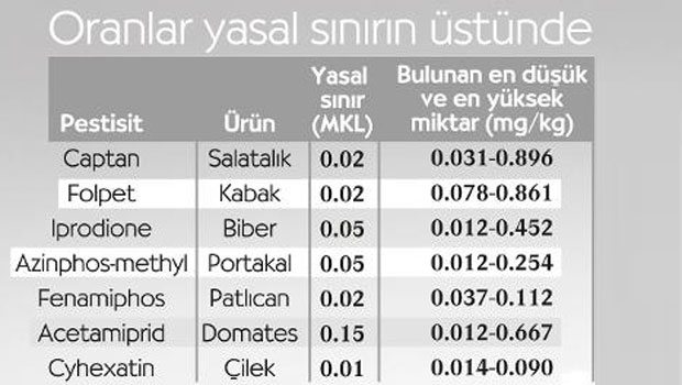 2013'te 163 domates, 82 yeşil biber, 91 salatalık, 25 kabak ve 39 çilek örneği olmak üzere toplam 400 adet meyve ve sebzenin yüzde 21'inde mevzuatta belirtilen limit değerlerin üzerinde pestisit kalıntısı bulunduğu ortaya çıktı. 2014'ün aynı döneminde analiz edilen 106 domates, 53 yeşil biber, 37 salatalık, 22 kabak, 21 çilek, 16 patlıcan ve 54 portakal olmak üzere 309 adet ürünün ise yüzde 25'inde limit değerlerin üzerinde kimyasal madde kalıntısına rastlandı.