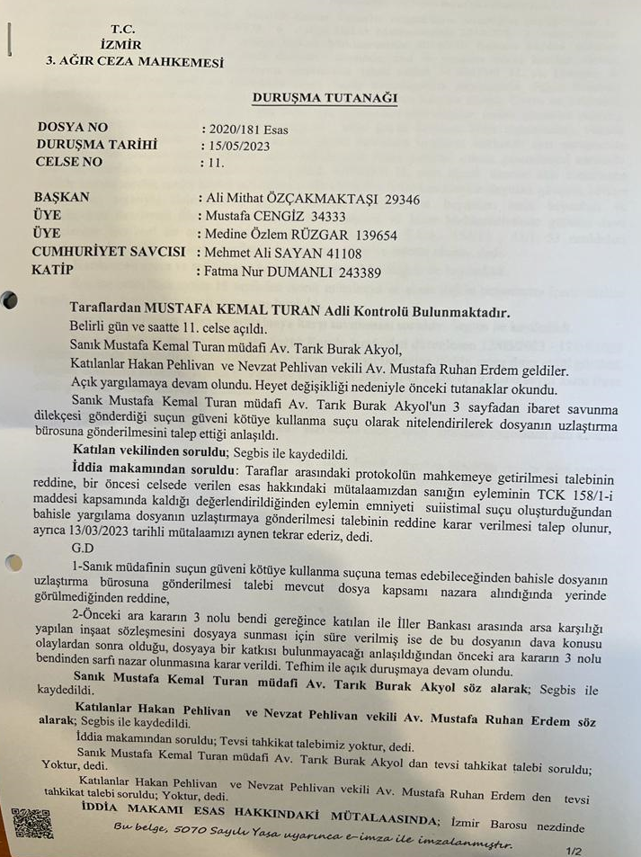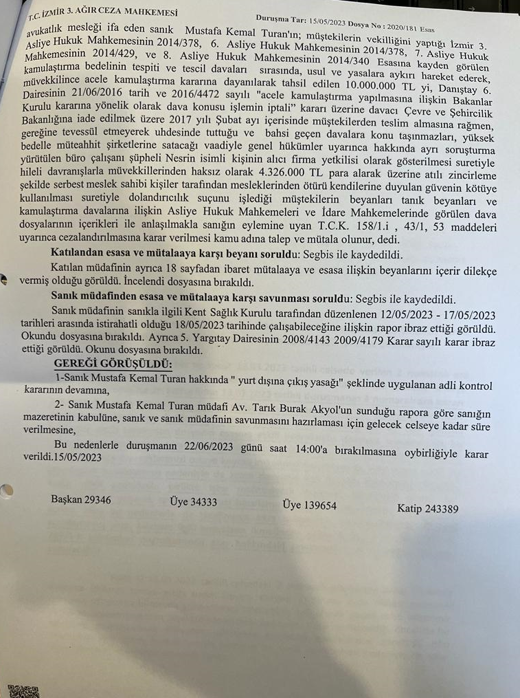 İzmir 3'üncü Ağır Ceza Mahkemesi'nde görülen davada, Avukat Mustafa Kemal Turan güveni kötüye kullanmak suretiyle nitelikli dolandırıcılık suçuyla yargılanıyor. Son olarak 15 Mayıs'ta görülen duruşmada savcı mütalaa vererek sanık Avukat Mustafa Kemal Turan hakkında ceza verilmesini talep etti.