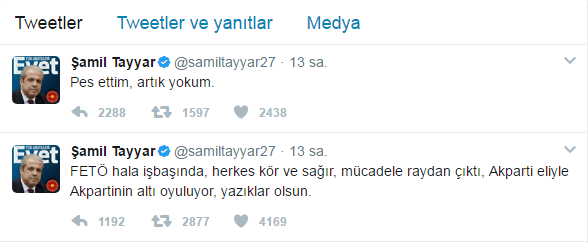 Söz konusu paylaşımlarda 'FETÖ halen iş başında, herkes kör ve sağır, mücadele raydan çıktı, Ak Parti eliyle Ak Parti'nin altı oyuluyor, yazıklar olsun' denilirken, bir sonraki tweette ise, 'Pes ettim, artık yokum' ifadeleri kullanıldı.