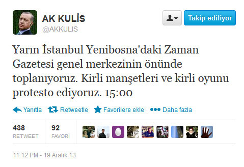 İSTANBUL - Son operasyonun arkasından AK Parti ile cemaat arasındaki ipler iyice koptu. Operasyonun arkasında cemaatin olduğunu iddia eden AK partililer bugün protestolarını sokağa taşıyor. AK Partililer, bugün Zaman gazetesi önünde büyük bir protesto eylemi yapmaya hazırlanıyor. Sosyal medyada yapılan çağrılarda Zaman gazetesinin manşetleri eleştirilerek, 'Yarın (20 Aralık Cuma) İstanbul Yenibosna'daki Zaman Gazetesi genel merkezinin önünde toplanıyoruz. Kirli manşetleri ve kirli oyunu protesto ediyoruz. Saat 15:00'te' denildi. Çağrının AK Parti Genel merkezine yakın kişilerin yönettiği iddia edilen bir hesaptan yapılması dikkat çekti.