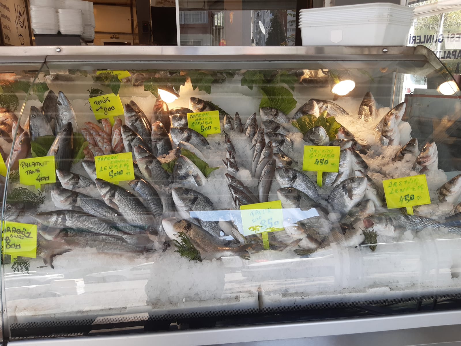 Balık satışı yapan esnafın tezgahında balıklar, farklı etiketler taşıyor. Üretim levrek ve çipura ortalama 450 liradan satılıyor. Toprak havuz levrek ve çipura fiyatı 500 lira… Deniz levrek ve çipura, 800 lira. Karagöz 800, Tekir 900, Granyoz 650, Tavuk balığı 850, palamut 400 liradan satılıyor.