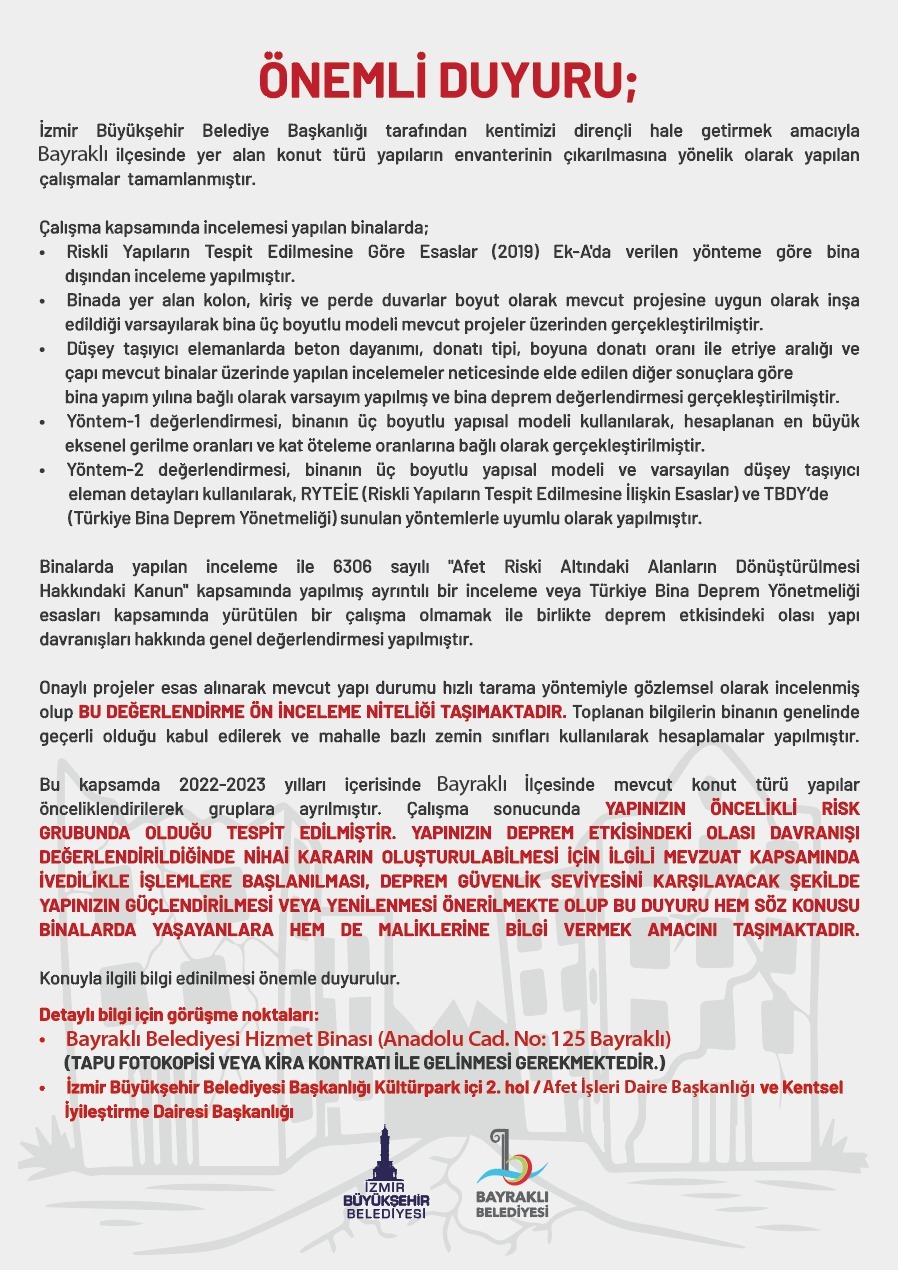 Hazırlanan bilgi metninde değerlendirmenin ‘ön inceleme’ niteliğinde olduğu vurgulanırken, ‘Yapınızın öncelikli risk grubunda olduğu tespit edilmiştir. Yapınızın deprem etkisindeki olası davranışı değerlendirildiğinde nihai kararın oluşturulabilmesi için ilgili mevzuat kapsamında ivedilikle işlemlere başlanılması, deprem güvenlik seviyesini karşılayacak şekilde yapınızın güçlendirilmesi veya yenilenmesi önerilmekte olup bu duyuru hem söz konusu binalarda yaşayanlara hem de maliklerine bilgi vermek amacını taşımaktadır’ ifadelerine yer verildi.