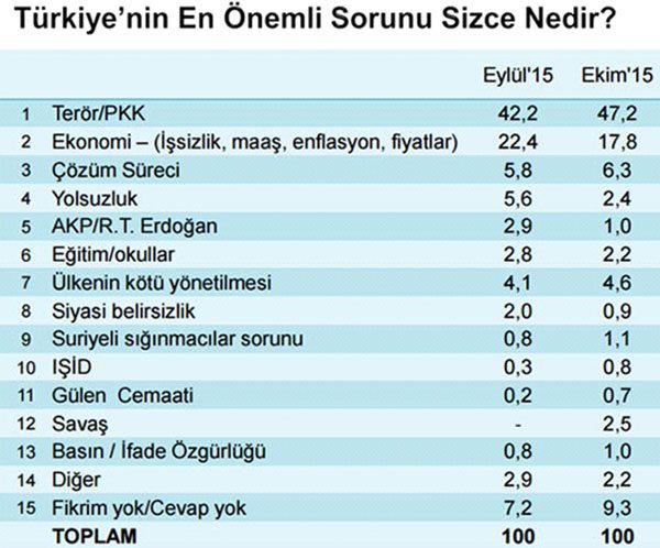 Ankete katılanların yüzde 46'sı Türkiye'nin en önemli sorununun terör olduğunu düşünüyor. Bu oran geçen ay yüzde 36 düzeyindeydi. Terörü yüzde 18 ile ekonomi, yüzde 6 ile Kürt sorunu, yüzde 5 ile hükümet yönetimi takip ediyor.