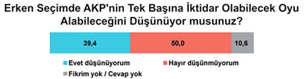 Ankete katılanların yüzde 50'si 1 Kasım seçimlerinde AK Parti'nin tek başına iktidar olamayacağını, yüzde 39'u ise olacağını öne sürüyor. Ağustos ayında AK Parti'nin tek başına iktidar olabileceğini düşünenlerin oranı yüzde 43, Eylül ayında ise yüzde 40 idi.