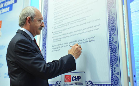 CHP Genel Başkanı Kemal Kılıçdaroğlu da büyük bir panoya yerleştirilen taahhütnameyi sembolik olarak imzaladı.