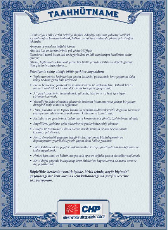 'Cumhuriyet Halk Partisi Belediye Başkan Adaylığı sıfatıma yüklediği tarihsel sorumluluğun bilincinde olarak; halkımızın yüksek iradesiyle göreve getirildiğim takdirde: Anayasa ve yasalara bağlılık içinde; Atatürk ilke ve devrimlerinin yol göstericiliğiyle; Demokrasi, temel insan hak ve özgürlükleri ve laik cumhuriyet ideallerine sahip çıkarak; Ulusal, toplumsal ve kamusal yaran her türlü yarardan üstün ve değerli görerek tüm gücümle çalışacağıma, Belediyenin sahip olduğu bütün yetki ve kaynakları: Toplumun bütün kesimlerinin yaşam kalitesini yükseltmek, kent yaşamım daha kolay ve daha güzel hale getirmek; Planlı kentleşme, şehircilik ve mimarlık kural ve ilkelerine bağlı kalarak kentin mimari, tarihsel ve kültürel dokusunu koruyarak geliştirmek; Altyapı hizmetlerini tamamlamak, güvenli, hızlı ve ucuz kent içi ulaşım sistemleri kurmak; Yoksulluğu kader olmaktan çıkararak, herkesin insan onuruna yakışır bir yaşam düzeyine sahip olmasını sağlamak; Hava, gürültü, su ve toprak kirliliğini ortadan kaldırarak kentin doğasını korumak; çevreyle uyumlu enerji kaynaklarının kullanımını özendirmek; Kadınların ve gençlerin istihdamına ve korunmasına yönelik özel önlemler almak; Engellilere, yaşlılara, şehit ailelerine ve gazilerimize sahip çıkmak; Esnafın ve tüketicilerin dostu olarak, her iki kesimin de hak ve çıkarlarım koruyup geliştirmek; Kenti, demokratik yaşamın, hoşgörünün, toplumsal bütünleşmenin ve dayanışmanın geçerli olduğu bir yaşam alam haline getirmek; Etkili katılımcılık ve şeffaflık mekanizmaları kurup, yönetimde dürüstlüğü sonuna kadar uygulamak; Herkes için sanat ve küttür, her yaş için spor ve sağlıklı yaşam olanakları sağlamak; Kenti doğa, yaşamla buluşturup, kent bitkileri ve hayvanlarına da azami özen ve ilgiyi göstermek;