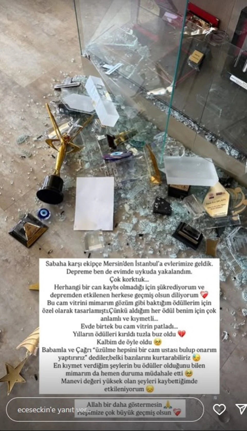 Depremlerin ardından ünlü şarkıcı Ece Seçkin yaptığı paylaşımla adından söz ettirdi. Depreme evinde uykuda yakalan Seçkin ödüllerinin tuzla buz olduğunu açıkladı: