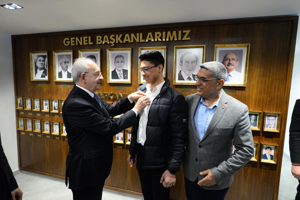CHP Lideri Kemal Kılıçdaroğlu, İl Başkanlığı'nda bir de rozet taktı. CHP İzmir İl Başkan Yardımcısı Sedrettin Coşkuner'in 18 yaşına giren oğlu olan Berkay Coşkuner'e CHP rozeti Genel Başkan Kemal Kılıçdaroğlu tarafından bizzat takıldı.