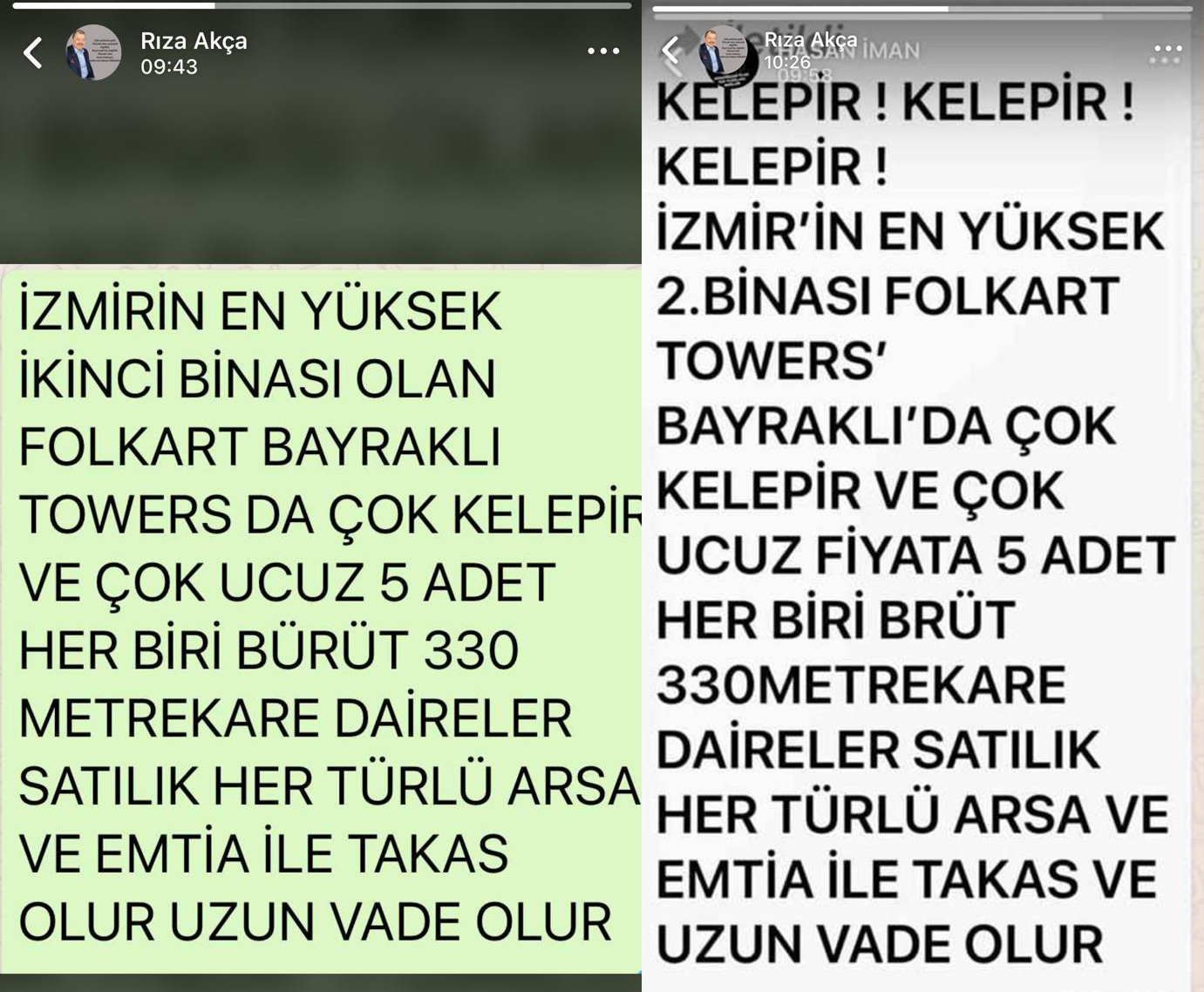 İşadamı Akça, Folkart'ta bulunan 5 adet dairesi için, 'Kelepir' ifadesini kullandı. Akça, 'İzmir'in en yüksek ikinci binası olan Folkart Towers Bayraklı'da çok kelepir ve çok ucuz fiyata 5 adet her biri brüt 330 metrekare daireler satılıktır. Her türlü arsa ve emtia ile takas olur, uzun vade olur' yazdı.