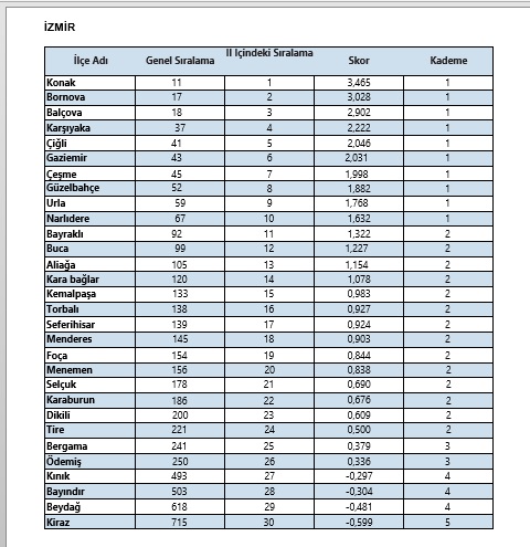 İzmir 1'inci kademede 10 ilçe yer alırken, 2'nci kademede 14 ilçe, 3'üncü kademede 2, 4'üncü kademede 3 ve 5'inci kademede 1 ilçe yer aldı. 6'ıncı kademede ise İzmir'den herhangi bir ilçe yer almadı.