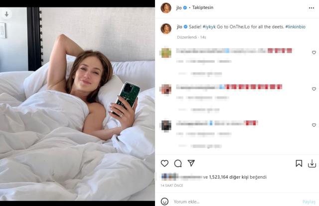 Sessiz sedasız evlenen Jennifer Lopez, nikah sonrası 218 milyon takipçisinin bulunduğu Instagram hesabından paylaşım yapmayı ihmal etmedi. Yatağında yarı çıplak ve makyajsız bir fotoğrafını yayınlayan Lopez, alyansını da göstermiş oldu. Dünyaca ünlü yıldız, alyans olarak da gümüş renginde sade bir yüzük tercih etti.