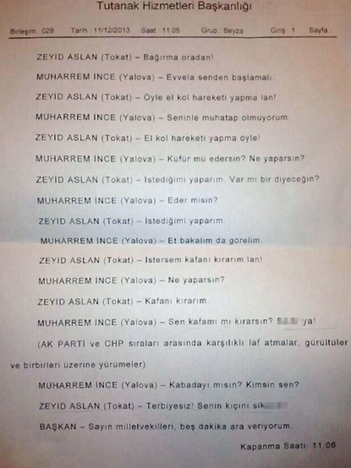 İnce'nin, Başbakan Tayyip Erdoğan'ın CHP'lilere yönelik 'terbiyesiz herifler' sözüne tepkisini dile getirdiği konuşmasının ardından yaşanan küfür skandalı Meclis tutanaklarına şöyle yansıdı: