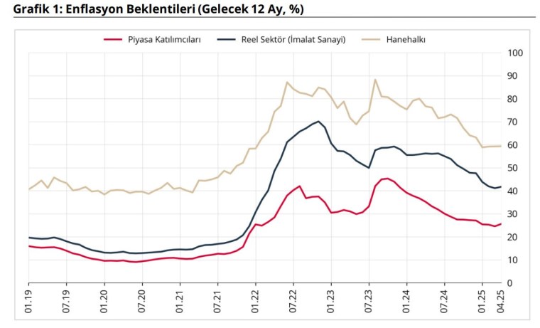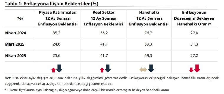 Nisan ayında, 12 ay sonrasına ilişkin yıllık enflasyon tahmini piyasa katılımcıları için yüzde 25,6'ya, reel sektör için yüzde 41,7'ye yükselirken; hanehalkı için ise değişmeyerek yüzde 59,3 seviyesinde kalmıştır.”
