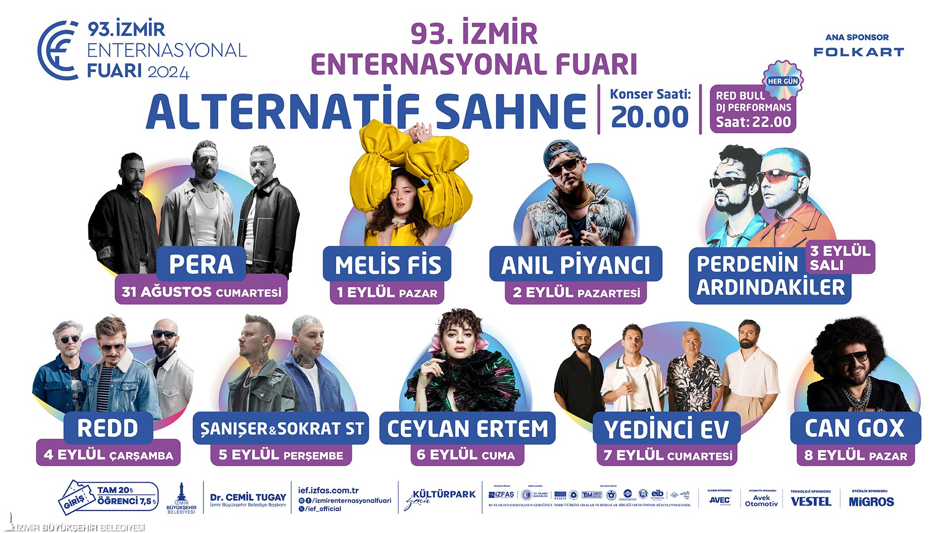 Ziyaretçiler, Fuar akşamlarında keyif dolu anlar yaşamak için her yıl olduğu gibi bu yıl da Fuar konserlerinde buluşacak. Çim Konserleri'nin ilki, Fuar'ın ilk günü olan 30 Ağustos Zafer Bayramı'nda Mert Demir ile başlayacak. Sırasıyla Teoman, Volkan Konak, Hande Yener, Semicenk, Motive, Mahsun Kırmızıgül, Hayko Cepkin ile Migros sponsorluğunda Derya Bedavacı ve Sakiler sahne alacak. Coşku, 9 Eylül'de İzmir'in kurtuluşunun 102. yılında Haluk Levent konseriyle zirveye çıkacak. Alternatif Sahne'de ise konserler 31 Ağustos'ta başlayacak. İlk akşam Pera, sonrasında ise Melis Fis, Anıl Piyancı, Perdenin Ardındakiler, Redd, Şanışer&Sokrat St, Ceylan Ertem, Yedinci Ev ve Can Gox sahne alacak.
