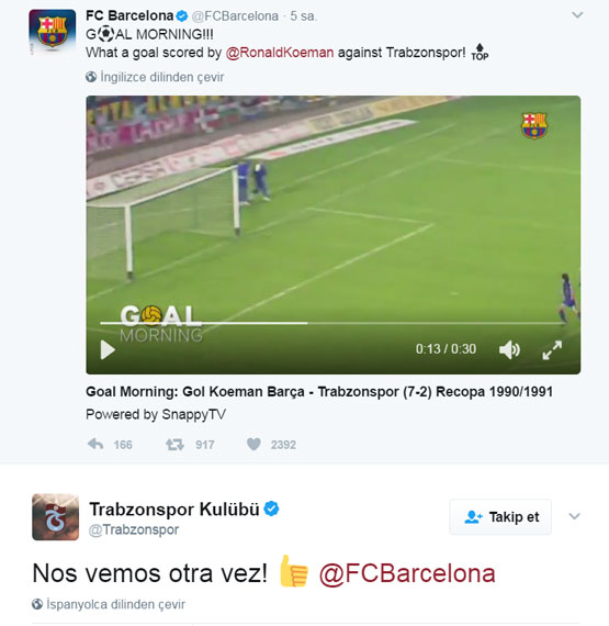 İspanya'nın Barcelona Kulübüne ait sosyal medya hesabı Twitter'dan, Ronald Koeman'ın Trabzonspor'a attığı bir golün videosunun paylaşılmasına bordo-mavili kulüpten cevap geldi.