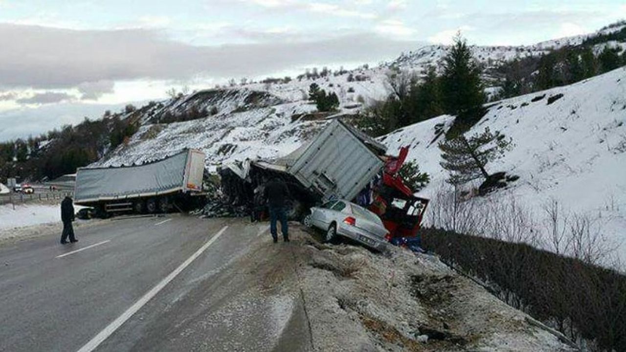 Afyonkarahisar-Antalya karayolunun 23. kilometresinde yoldaki gizli buzlanmaya nedeniyle 8 tır, bir yolcu otobüsü ve 2 otomobil çarpıştı.