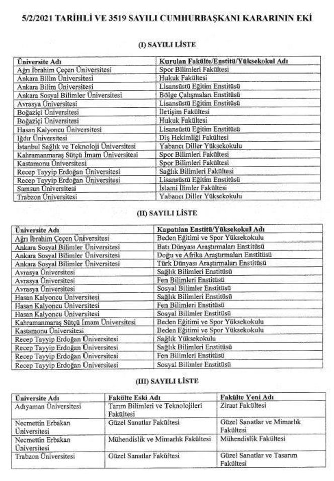 Türkiye Cumhurbaşkanı Recep Tayyip Erdoğan'ın imzasıyla Resmi Gazete'de yayımlanan karara göre, Ağrı İbrahim Çeçen Üniversitesinde Lisansüstü Eğitim Enstitüsü ve Spor Bilimleri Fakültesi, Aksaray Üniversitesinde Diş Hekimliği Fakültesi, Bandırma Onyedi Eylül Üniversitesinde İslami İlimler Üniversitesi, İstanbul Atlas Üniversitesinde Lisansüstü Eğitim Enstitüsü, İstanbul Sağlık ve Teknoloji Üniversitesinde Mühendislik ve Doğa Bilimleri Fakültesi ve Yabancı Diller Yüksekokulu, İskenderun Teknik Üniversitesinde Lisansüstü Eğitim Enstitüsü, Selçuk Üniversitesinde Selçuklu Araştırmaları Enstitüsü, Yalova Üniversitesinde Tıp Fakültesi ve Lisansüstü Eğitim Enstitüsü, Yozgat Bozok Üniversitesinde Lisansüstü Eğitim Enstitüsü, Ankara Bilim Üniversitesinde Hukuk Fakültesi ve Lisansüstü Eğitim Enstitüsü, Ankara Sosyal Bilimler Üniversitesinde Bölge Çalışmaları Enstitüsü, Avrasya Üniversitesinde Lisansüstü Eğitim Enstitüsü, Boğaziçi Üniversitesinde İletişim ve Hukuk Fakülteleri, Hasan Kalyoncu Üniversitesinde Lisansüstü Eğitim Enstitüsü, Iğdır Üniversitesinde Diş Hekimliği Fakültesi, Kahramanmaraş Sütçü İmam Üniversitesi ve Kastamonu Üniversitesinde Spor Bilimleri Fakültesi, Recep Tayyip Erdoğan Üniversitesinde Sağlık Bilimleri Fakültesi ve Lisansüstü Eğitim Enstitüsü, Samsun Üniversitesinde İslami İlimler Fakültesi ve Trabzon Üniversitesinde Yabancı Diller Yüksekokulu kuruldu.