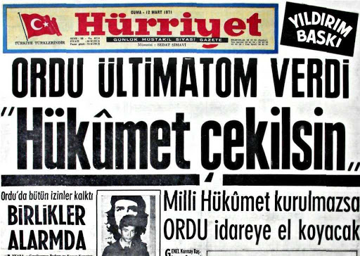 Bundan 50 yıl önce bir Cuma günüydü. Aynen bugün olduğu gibi. TRT'nin 12 Mart 1971 13.00 haber bülteninde spiker cümleleri vurgulamaya özen göstererek ordunun verdiği muhtırayı okuyordu. Genelkurmay Başkanı Orgeneral Memduh Tağmaç, Kara Kuvvetleri Komutanı Orgeneral Faruk Gürler, Deniz Kuvvetleri Komutanı Oramiral Celal Eyicioğlu ve Hava Kuvvetleri Komutanı Orgeneral Muhsin Batur verdikleri muhtıra ile Türkiye'nin içinde bulunduğu anarşi ve kardeş kavgasından Hükümet ve Parlamentoyu sorumlu tutuyorlardı. Komutanlar Atatürkçü ve inkılap kanunlarını uygulayacak inandırıcı bir hükümetin kurulmasını istiyordu. Bu istekleri gerçekleşmediği takdirde doğrudan idareye el koymaya kararlı olduklarını da tüm ülkeye duyuruyorlardı.