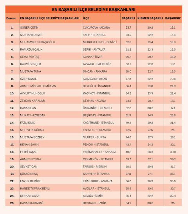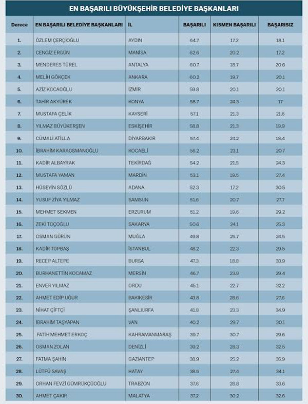 İkinci sırada yüzde 62,6'lık başarı oranıyla Manisa Büyükşehir Belediye Başkanı Cengiz Ergün bulunurken, üçüncü sırada yüzde 60,2'lik başarı oranıyla Antalya Büyükşehir Belediye Başkanı Menderes Türel yer aldı.