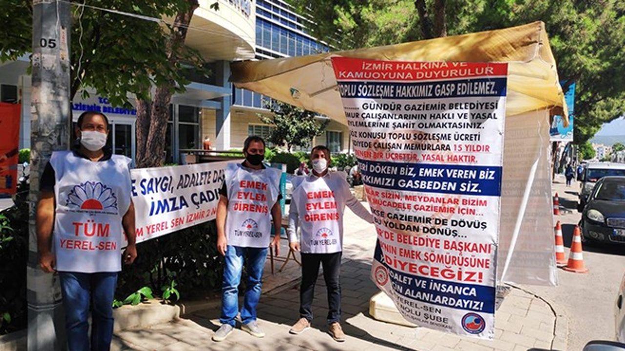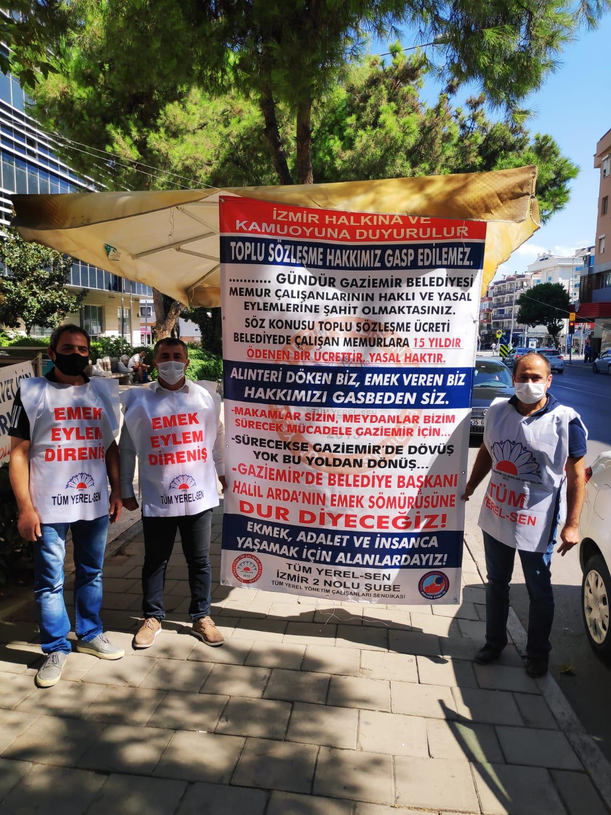 'Belediyemizle yaptığımız sözleşmenin tek taraflı feshedilmesiyle uğradığımız haksızlığı, kurduğumuz İmza Çadırı'nda vatandaşlarımıza anlatıyoruz. Halkımız da imza vererek mücadelemize destek oluyorlar. Haftaya yine eyleme yapacağız. Her hafta eylemde olacağız. Ta ki, hakkımızı geri alıncaya kadar... Belediye Başkanı Halil Arda'nın bize yaptığı bu haksızlığı, CHP Genel Başkanı Kemal Kılıçdaroğlu'na anlattık. Genel Başkan Yardımcısı Seyit Torun devreye girdi. Başkan Arda, partiyi de dinlemiyor, Genel Başkanı Kılıçdaroğlu'nu da... İlçe başkanıyla kavgalı. İl Başkanı Deniz Yücel'den yardım istedik. Yücel, konuyu Başkan ile görüştü ama Halil Arda, İl başkanını da dinlemedi. Ben öyle karar aldım, geriye dönmem' diyor, başka bir şey demiyor. 217 gündür iş bırakmla, yürüyüş, tabut eylemi gerçekleştirdik, defalarca... Halil Arda'yı, İmza Çadırımızdan emeğe saygılı, adaletli olmaya çağırıyoruz. Sonuç alıncaya kadar Gaziemir Belediyesi'nin önünden ayrılmayacağız.'