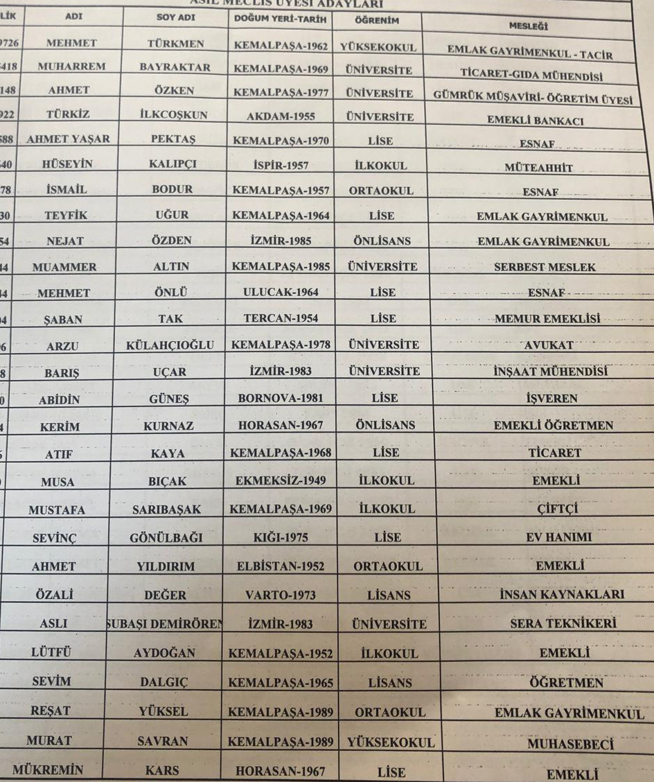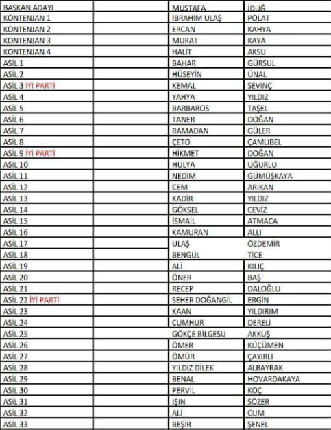 Başkan Adayı Ekrem Oran'ın listesinde 4 ve 12'nci sıralar İYİ Parti'ye bırakıldı. Kontenjan birinci sırada Aybars Yıldırım, ikinci sıra ise Kaan Kılıç'a ayrıldı. Listede birinci sırada; Fayika Öner yer aldı. Diğer isimler ise sıralamasıyla şu şekilde oluştu: Soner Varhan, Seyit Dolunay Onur, Hava Evci (İYİ Parti), Vehbi Özen, Özay Dinç, Mehmet Aksu, Ali Can, Kazım Beyaz, Sabise Suna Tamer, Şeniz İridere, İsmail Durmuş (İYİ Parti), Simge Dura