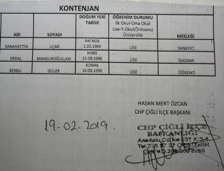İkinci sıra ise partinin tecrübeli ismi Kazım Çam'a ayrıldı. Listeye ayrıca Zeynep Ferda Demirbaş, Memet Eren, Gizem Albaş (İYİ Parti) İsmail Kandemir, Ender Özkılınç, Aras Kaynarca, Yaşar Üremiş, Osman Kaçmaz, Sema Özbaş, Menekşe Işın, Tuncay Özenç yazıldı. Kontenjan birinci sırada Ozan Parlar ve ikinci sırada Ali Rıza Özkan isimleri yer aldı.