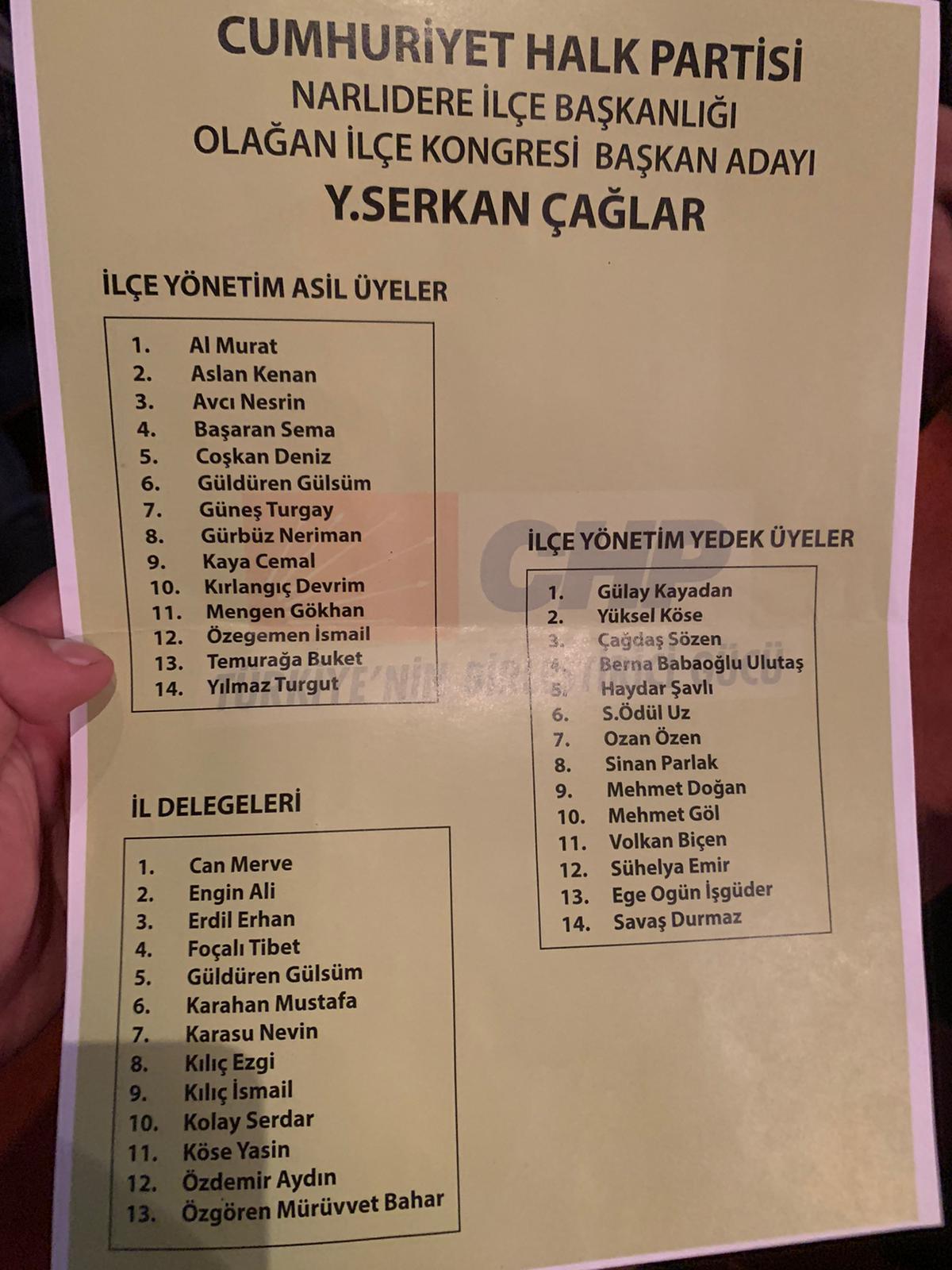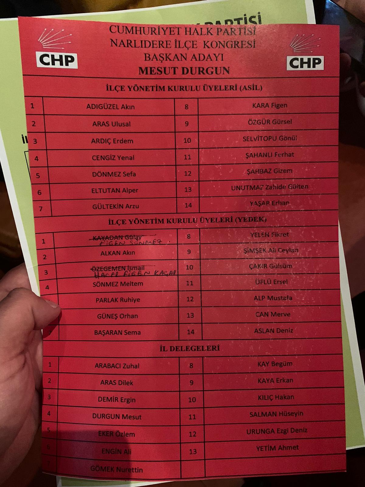 Narlıdere'de görevde olan İlçe Başkanı Şahin Fırat 'yokum' dedi. Fırat'ın adaylığa soyunmadığı kongrede yönetimin içinden çıkan iki ismin yarışı yaşandı. İlçe Sekreteri Serkan Çağlar ve İlçe Yöneticisi Mesut Durgun delegeden oy istedi. 164 oy alan Durgun 100 oy alan Çağlar'ı sandıkta bmağlup etti.