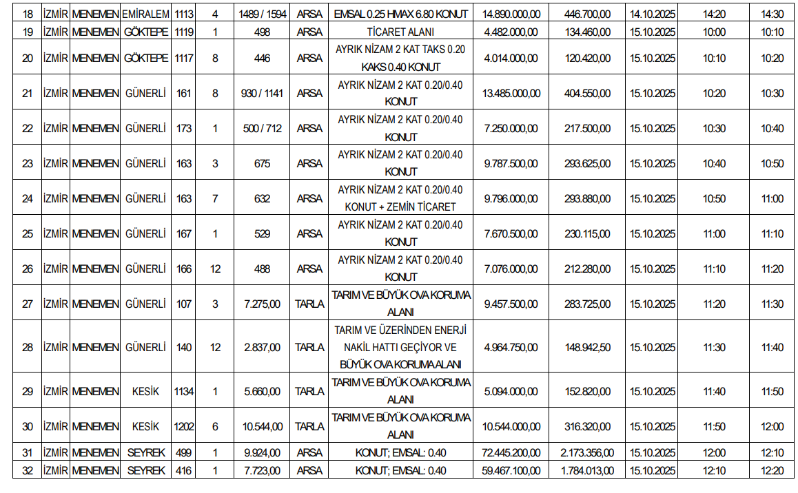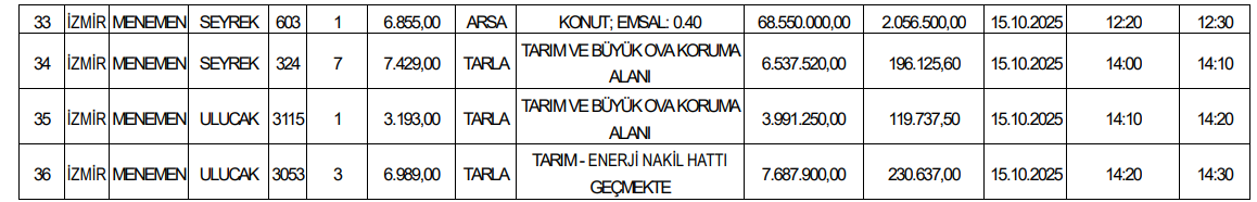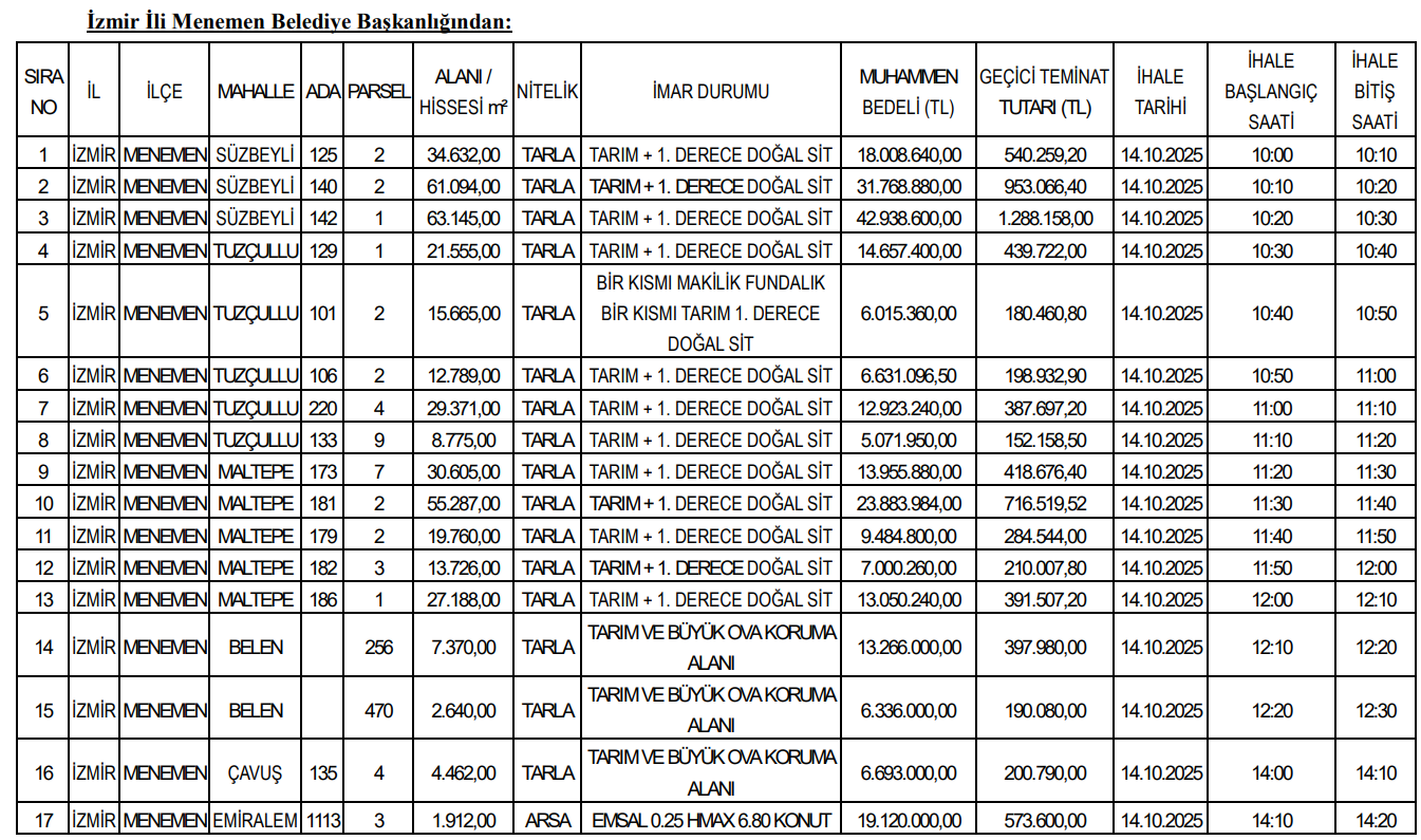 Satışa konu taşınmazlar arasında Süzbeyli, Tuzçullu, Maltepe, Belen, Çavuş, Emiralem, Göktepe, Günerli, Kesik, Seyrek ve Ulucak mahallelerinde yer alan tarlalar ile konut ve ticaret imarlı arsalar bulunuyor. Satışa çıkarılan bazı parsellerin birinci derece doğal SİT statüsünde olması dikkat çekti.