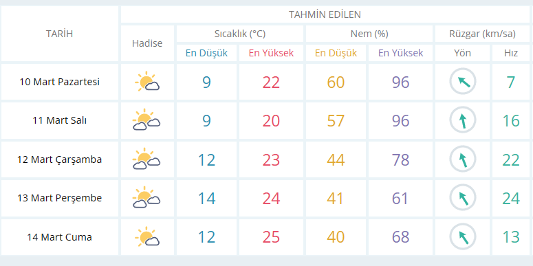 En yüksek hava sıcaklığı 22 dereceden 25 dereceye, en düşük hava sıcaklığı ise 9 dereceden 14 dereceye kadar çıkacak.