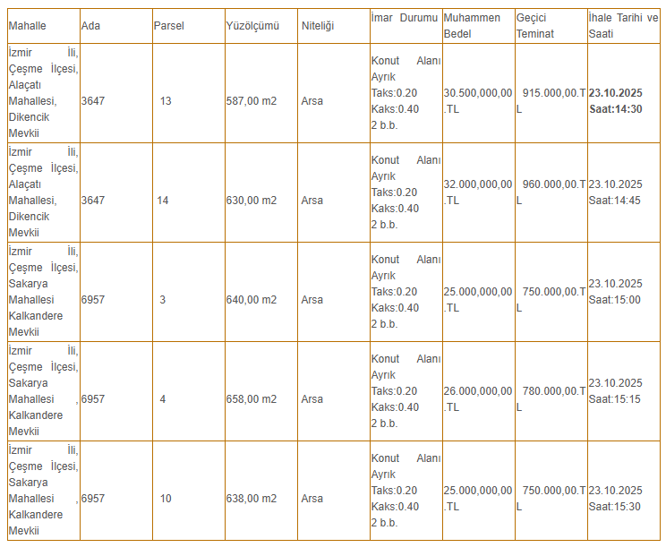 Satışa çıkarılan arsaların muhammen bedelleri 25 milyon TL ile 32 milyon TL arasında değişiyor. En yüksek bedelli taşınmaz Alaçatı Mahallesi Dikencik Mevkii’ndeki 630 metrekarelik arsa olurken, en düşük bedelli taşınmaz ise Sakarya Mahallesi Kalkandere Mevkii’ndeki 640 metrekarelik arsa olarak belirlendi.