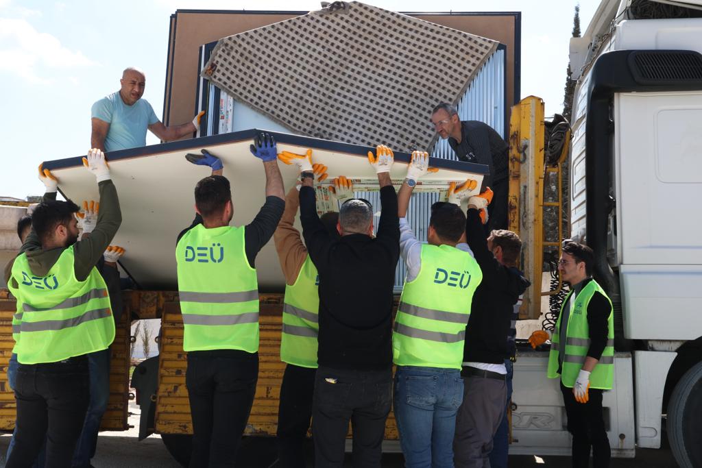 Dokuz Eylül Üniversitesi Yapı İşleri ve Teknik Daire Başkanlığı Teknik Atölyeler Şube Müdürlüğümüz tarafından bugüne kadar toplam 8 konteyner üretildi. Halen deprem bölgesinde; derslik, mutfak ve fizik tedavi ünitesi gibi amaçlarla kullanılmaya devam edilen bu birimler; mekansal kalitesi, yalıtımlı panelleri, sökülüp takılır niteliği, kalifiye işçilik gerektirmeden kolayca kurulma özelliğiyle öne çıkıyor. Yine DEÜ Mimarlık Fakültesi tarafından tasarlanan Afet Sonrası Hızlı Kurulabilir Yaşam Ünitesi, Üniversitenin öz kaynaklarıyla toplam 18 adet üretilerek; Hatay'ın Kırıkhan ilçesine gönderildi. Üniteler burada, 'Dokuz Eylül Çarşı Yaşam Alanı'nı oluşturdu. Deprem sonrası hayatın normal akışına dönmesini kolaylaştıracak adımlardan biri olarak görülen bu konteynerler, bölge halkının kalkınması açısından da büyük önem arz ediyor.
