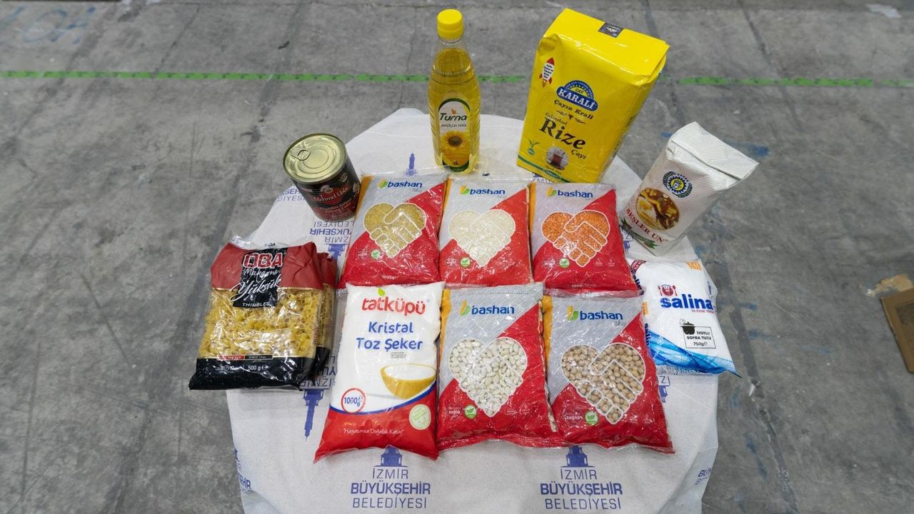İzmir Büyükşehir Belediyesi’nin hanelere teslim ettiği paket içinde mercimek, pirinç, kuru fasulye, nohut, makarna, bulgur, salça, un, sıvı yağ, tuz, çay ve şeker yer aldı.