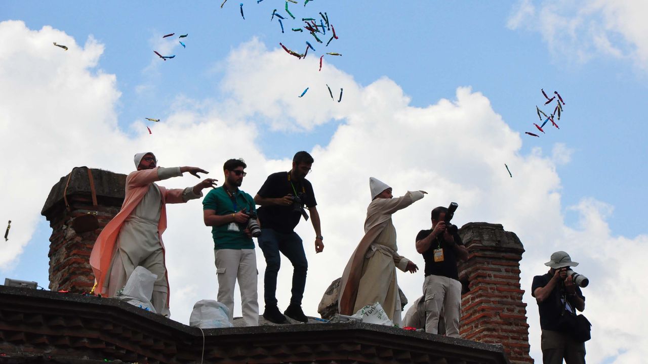 Öğle namazına müteakip temsili Hafsa Sultan’ın Merkez Efendi’ye berat vermesinin ardından Sultan Camisi’nin kubbe ve minarelerinden alanda ellerini açarak bekleyenlere şifalı macunlar saçıldı. 44 ayrı noktadan yapılan saçım 20 dakika boyunca sürdü. Vatandaşlar, camiye yakın binalarda da saçımı gerçekleştirilen şifalı macunlardan kapmak için birbiriyle yarıştı. Bazıları çıktıkları aydınlatma direkleri ve ağaçlar üzerinde şemsiyelerini ters çevirerek mesir macunu toplarken, ortaya renkli görüntüler çıktı.
