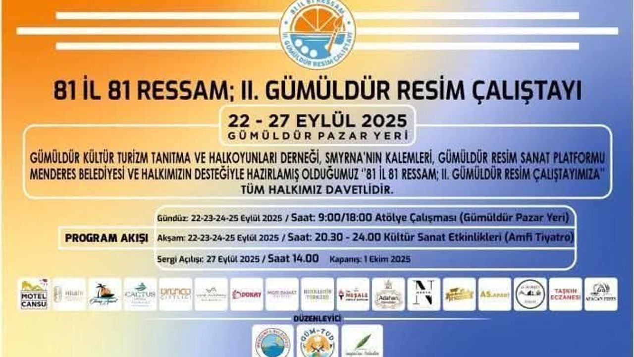 Menderes Belediyesi’nin katkıları ile Gümüldür Kültür Turizm Tanıtma ve Halk Oyunları Derneği’nin düzenlediği 2. Gümüldür Resim Çalıştayı 22-27 Eylül tarihleri arasında gerçekleştirilecek. 81 ilden 81 ressamın yer alacağı çalıştayda çeşitli etkinlikler ve atölyeler düzenlenecek. Yoğun bir program akışı ile dolu dolu geçecek olan çalıştayın son gününde sergi açılışı yapılacak. Sergi 1 Ekim tarihine kadar ziyaret edilebilecek. Çalıştaya, Menderes Belediyesi’nin yanı sıra Smyrna’nın Kalemleri ve Gümüldür Resim Sanat Platformu’da destek veriyor.