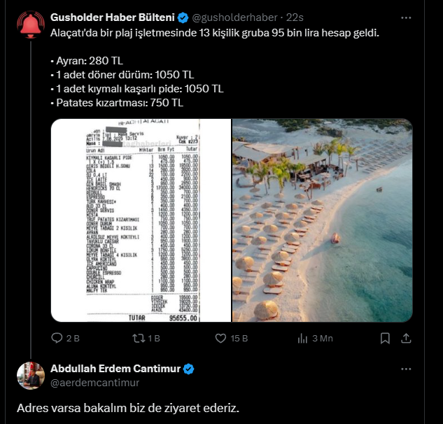 Son olarak Alaçatı'daki bir işletmede gelen hesap sosyal medyada gündem oldu. Alaçatı Beach'a isimli işletmeye ait olduğu belirtilen adisyona göre 13 kişilik bir masanın hesabı 95 bin 655 TL tuttu. Adisyona göre giriş ücreti için kişi başı 1500 TL olurken 400 mililitrelik su için 100 TL, kola ve ayran için 280 TL, Türk kahvesi için 350 TL, döner dürüm ve kıymalı kaşarlı pide için 1050 TL, patates kızartması için 750 TL