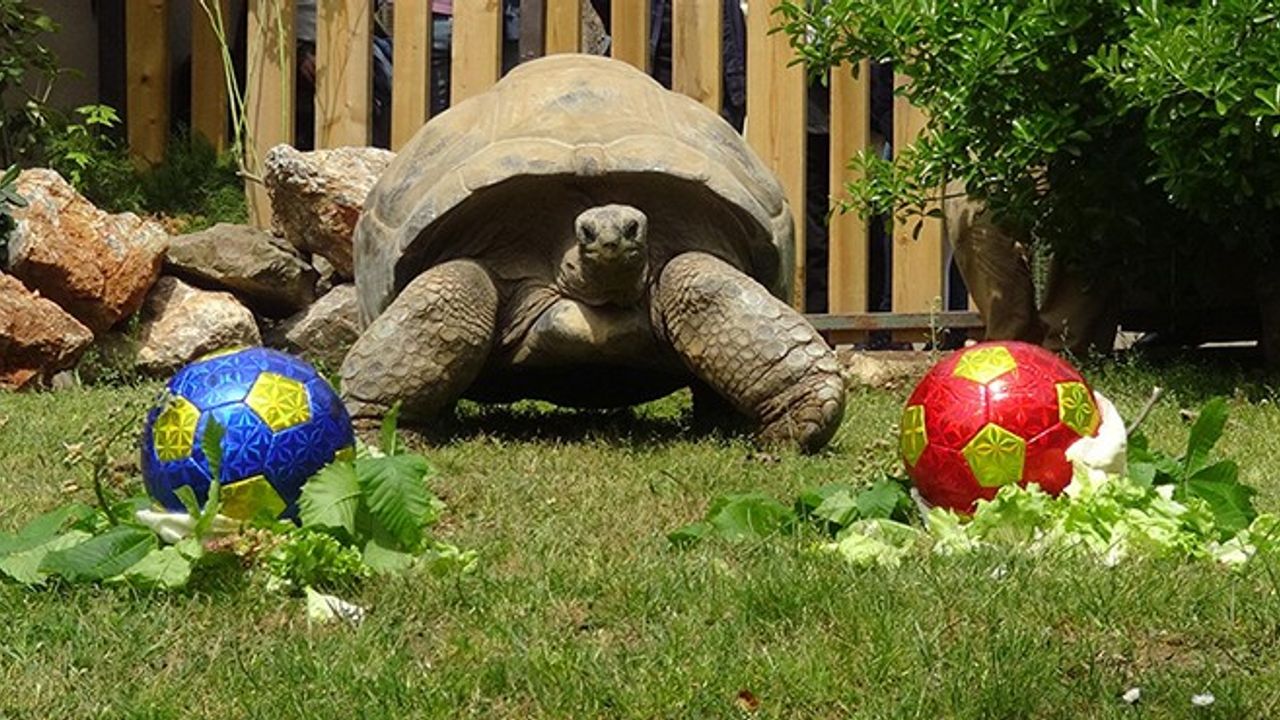Nesli tükenme tehlikesi altındaki türlerden olan ve 99 yaşına giren dev Aldabra kaplumbağası 'Tuki' için doğum günü ve derbi tahmini etkinliği düzenlendi. Spor Toto Süper Lig'in 28. haftasında yarın yapılacak Fenerbahçe-Galatasaray derbisine ilişkin tahmini merak edilen Tuki'nin kafesine sarı-kırmızı ve sarı-lacivert renkte futbol topları konuldu. Daha önce aynı yöntemle Dünya Kupası finali de dahil 5 derbinin galibini doğru tahmin eden Tuki, sarı-kırmızılı ekibin renklerini barındıran topa yöneldi.