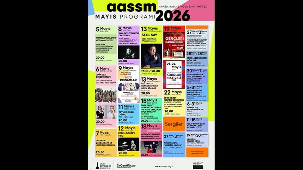 İzmirli sanatseverler, ilkbaharı yine sanatla uğurluyor. İzmir Büyükşehir Belediyesi Ahmed Adnan Saygun Sanat Merkezi, mayıs ayı programıyla sanatın farklı dallarını bir araya getiriyor. Konserler, atölyeler, sahne performansları, festivaller, sergiler ve Atatürk’ü Anma, Gençlik ve Spor Bayramı kutlamalarını içeren kapsamlı program, İzmirlileri bekliyor.
