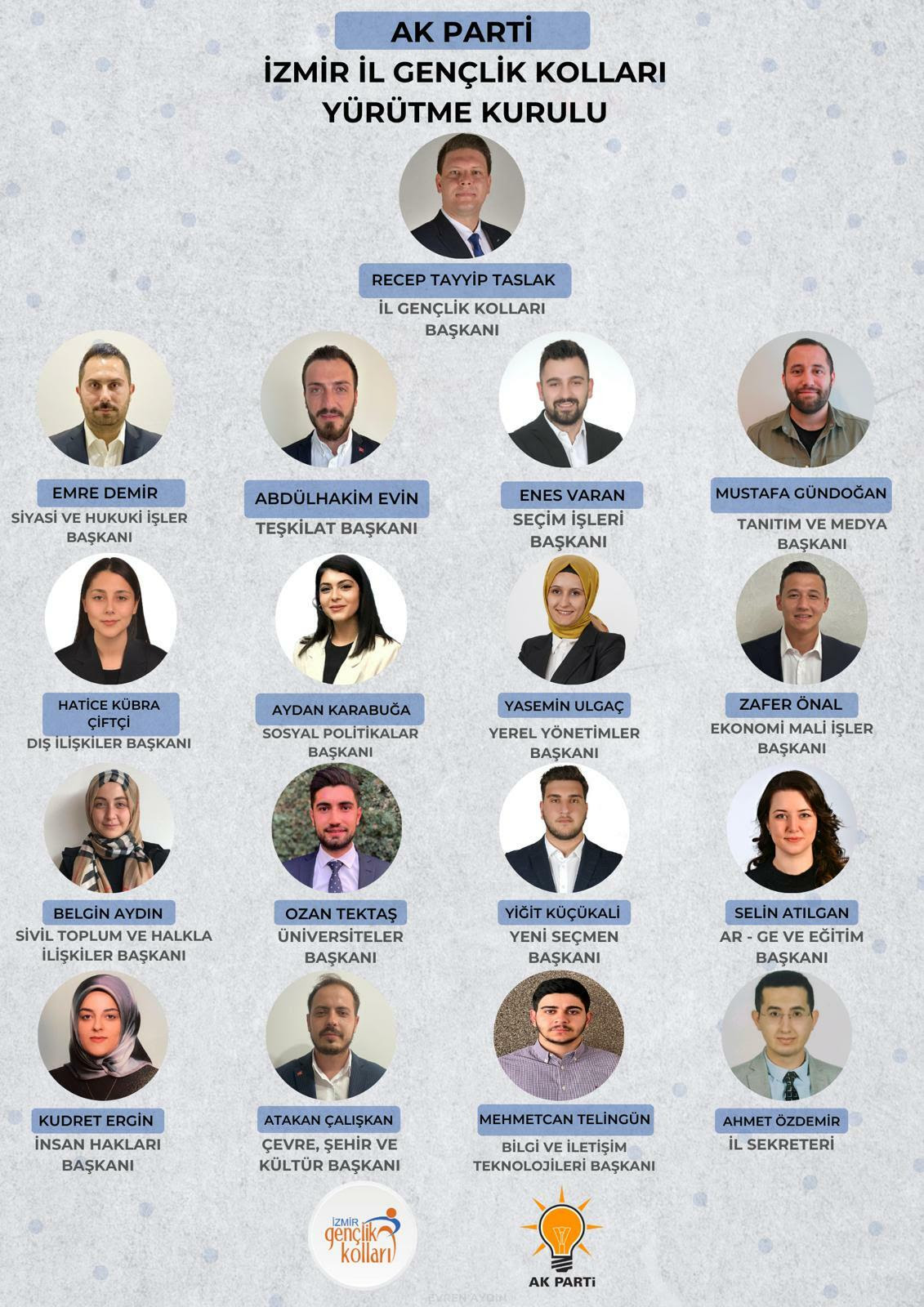 AK Parti İzmir Gençlik Kolları'nda, dün itibariyle Yürütme Kurulu'nda bir değişiklik gerçekleştirildi. 2023 Mayıs ayında gerçekleştirilen Cumhurbaşkanı Seçimi ve 28. Dönem Milletvekili Genel Seçimi'ni de içine alan 2 buçuk yıldır İl Gençlik Kolları Başkanlığı görevini yürüten Recep Tayyip Taslak, AK Gençlik İzmir ve 30 İlçe teşkilatı ile birlikte 'İlk oyum Erdoğan'a' programları, Genç STK ve Esnaf Buluşmaları, Ramazan ayında 'İftara 5 kala' programları, ilk defa oy kullanacak gençlerin evlerine ziyaretler, biri birincilikle olmak üzere 4 defa dereceye girilen ülke geneli üyelik çalışmaları olmak üzere başarılı çalışmalara imza attı.