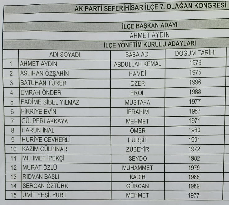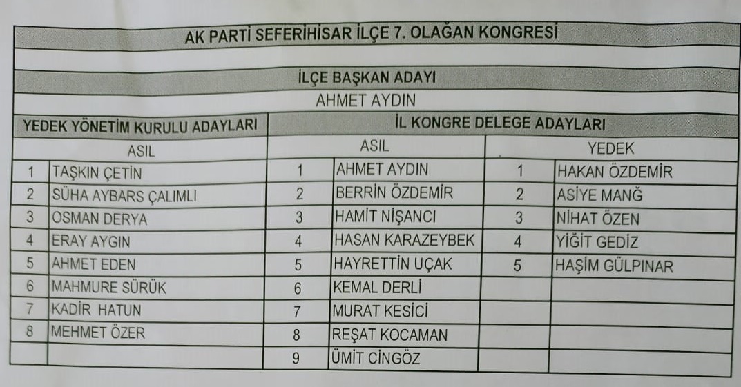 Kongre'de ayrıca Ahmet Aydın'ın listesi de belli oldu. Aydın'ın listesinde şu isimler yer alıyor: