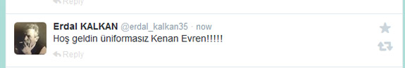 Kalkan, Twitter'dan paylaştığı mesajda 'Hoş geldin üniformasız Kenan Evren' ifadelerini kullandı.