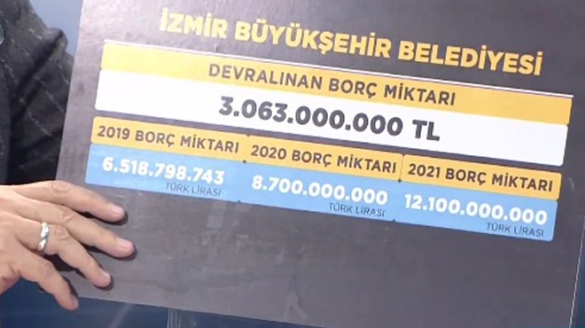 İzmir Büyükşehir Belediyesi hızla borcu artan bir belediye. Belediye başkanımız Seferihisar'ı iflas ettirip Büyükşehir'e geldi. Şimdi Büyükşehir Belediyesi de iflasa sürükleniyor. Şirket olsaydı; Ticaret Hukuku hükümlerine göre iflas ederdi. CHP Aziz Kocaoğlu döneminden 3 milyar 63 milyon TL borç ile devraldı. Alır almaz yıl sonunda borç 6 milyar 518 milyon 798 bin 743 TL oldu. 2020 yılında da artarak devam etti ve bu yıl Büyükşehir Belediyesi'nin borcu 12 milyar 100 milyon TL'ye ulaştı. Büyükşehir'in geldiği durum bu…'
