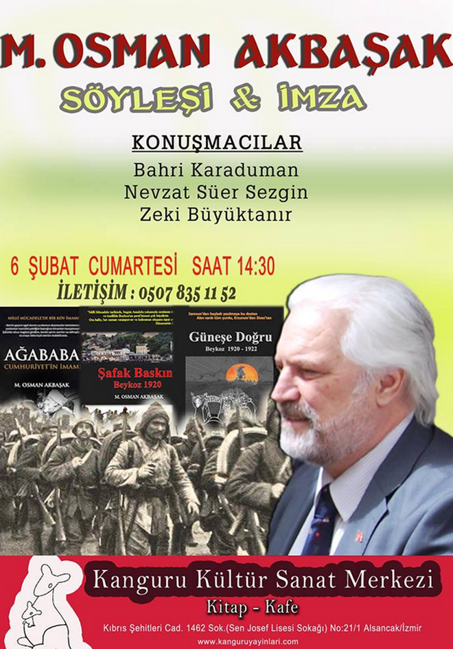 İzmir aşığı olarak bilinen M. Osman Akbaşak'ın söyleşi ve imza günü 6 Şubat Cumartesi Saat: 14.30'da Kanguru Yayınlarını Alsancak'taki Sanat Merkezi'nde gerçekleşecek. Akbaşak'ın Kurtuluş Şavaşı üçlemesi olan 'Milli Mücadelede Beykoz' kitapları üzerine gerçekleşecek söyleşiye konuşmacı olarak, Bahri Karaduman, Nevzat Süer Sezgin ve Zeki Büyüktanır da katılacak.