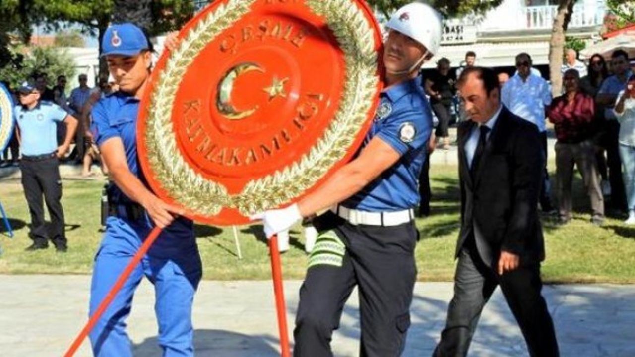 Etkinlik, Alaçatı eski Alaçatı Belediyesi binasında Çeşme Belediye Başkanı Muhittin Dalgıç'ın tebrikleri kabul etmesiyle başladı. Törene, Çeşme Kaymakamı Hacı Mehmet Kara, Garnizon Komutanı Vekili Personel Asteğmen Fatih Oruç, Cumhuriyet Başsavcısı Aşkın Yeğin, İlçe Jandarma Komutanı Yarbay Emin Yılmaz, CHP Genel Başkan Yardımcısı Prof. Dr. Fethi Açıkel, gaziler ve vatandaşlar katıldı. Dalgıç'ın tebrikleri kabulünün ardından tören Atatürk Anıtı'na çelenk sunulması, saygı duruşu ve İstiklal Marşı'nın okunmasıyla devam etti.