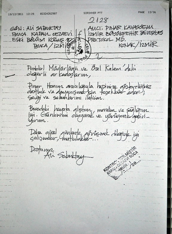 Buca Kapalı Cezaevi Eski Bölüm 10. Koğuş'tan belediye çalışanlarına 'tele post' yöntemiyle faks çeken Sabuktay, ' Hepinize gösterdiğiniz dostluk ve dayanışma için teşekkür ederim. Eğer halimi soran olursa yüksek moralli ve iyiyim Buradaki hayata alıştım. Sağlığım da çok iyi. Günlerimi kitap okuyarak, yürüyerek ve volta atarak geçiriyorum' dedi.