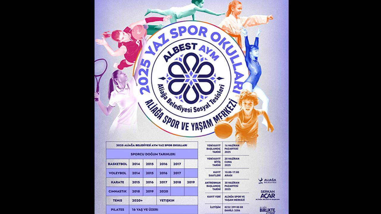 Aliağa Belediyesi’nin Aliağa Spor ve Yaşam Merkezi’nde düzenlenecek yaz spor kursları için detaylar belli oldu. Basketbol ve voleybol branşlarına 2014-2017, karateye 2015-2019 ve cimnastiğe ise 2018-2020 doğumlu sporcular başvurabilecek. Tenis için 2020 ve üzeri doğumlu çocuk sınıfının yanı sıra yetişkin sınıfı da açılacak. Pilates ise 16 yaş ve üzeri katılımcılara açık olacak.