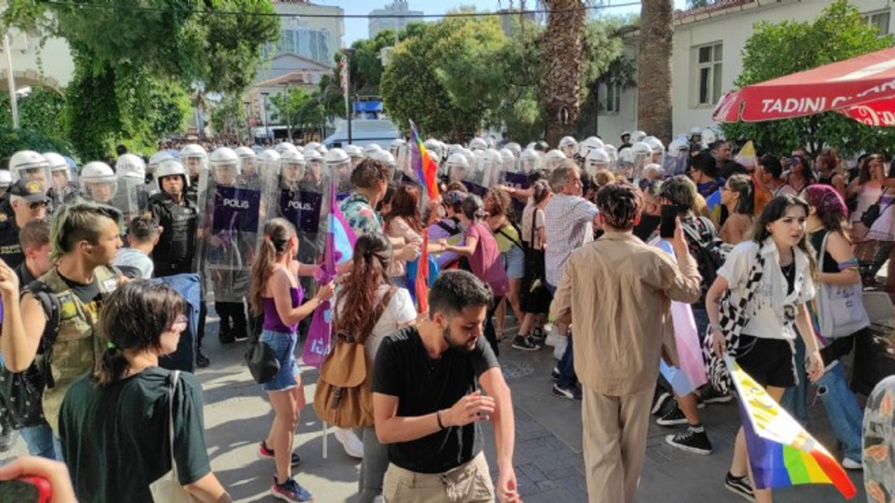 LGBTİ+ kurumlarının çağrısıyla çok sayıda kişi Alsancak'ta bir araya geldi. Polisin yoğun güvenlik önlemleri aldığının görüldüğü bölgede yapılmak istenen yürüyüşe polis izin vermeyecek müdahale etti.